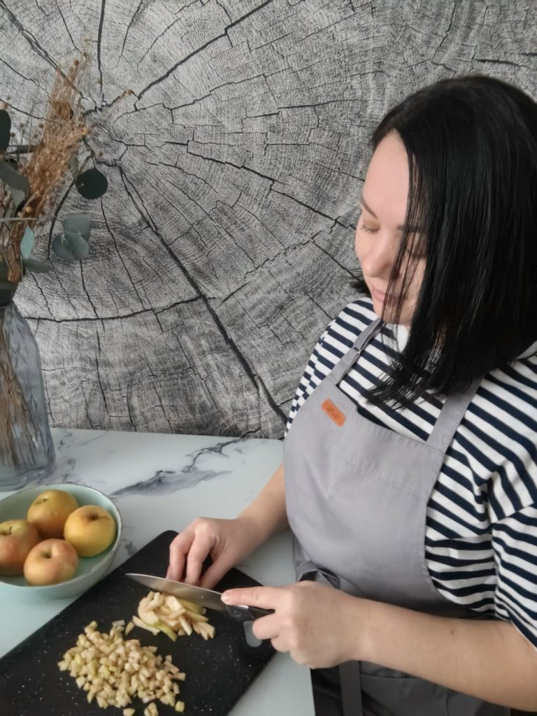 Яблоки очистите и нарежьте мелкими кубиками.