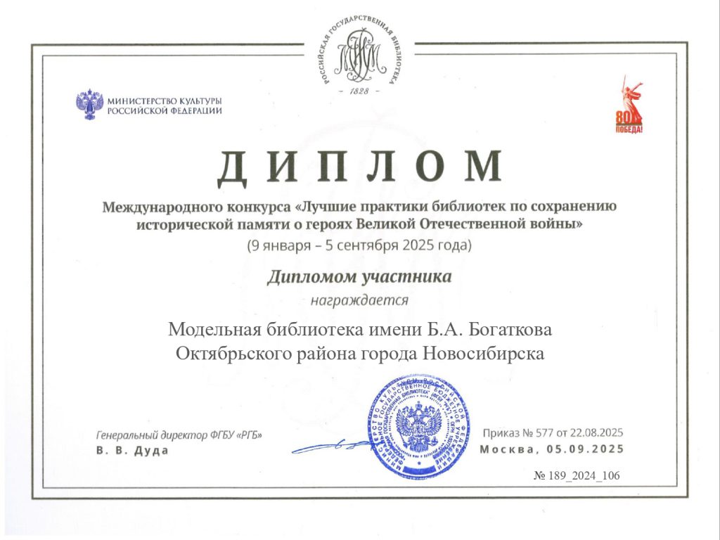 - Благодарственное письмо Администрации Октябрьского района города Новосибирска за вклад в развитие библиотечного дела в Октябрьском районе, и в связи с 65-летием библиотеки им. Б. А. Богаткова.